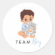 This adorable “Team Boy” sticker features a sweet baby boy dressed in blue, holding a stuffed bear and a matching pacifier. It’s perfect for adding a fun touch to your gender reveal party décor or favor bags. The text can be changed to fit your event style.