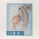 Baby boy photo birth announcement puzzle personalized with a big photo against a baby blue background. A teddy bear with a blue bow tie in one corner as a cute overlay on the photo of your newborn son. His birth stats against a blue label where you can write down height, weight, time of birth, and date.