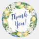 Dieses Dankeschön-Bridal-Sticker wurde für die Jenny's Lemon Collection entworfen und bietet einen gelben Zitronen- und weißen Blumenkranz. Die blauen Kacheln sind um den Rand des runden Aufklebers herum eingeprägt. Vielen Dank ist in einem modernen und trendigen Script-Schriftart geschrieben.