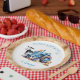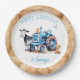Hof Geburtstag, Traktor und Tiere Papier Teller. Runde Teller mit blauem Traktor-Design und individuellem blauen Text. Der Beispieltext lautet: "Glücklich zum Geburtstag (Name)". Eine lustige Kuh flüchtige Blicke hinter dem Traktor, während ein Welpe sitzt in der Nähe. Eine kleine gelbe Katze ist oben auf dem Traktor, und ein Blauvogel fliegt darüber. Das Design ist in verschiedenen Schichten gehalten und von goldbraunem Heu umgeben.