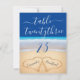 Dark Blue Beach Wedding Tischnummer Card. Zwei Herzen im Sand, dunkelblauer Hintergrund