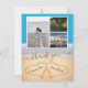 Blue Beach Hochzeit Danke Karte. Mit einer Collage aus 3 Fotos, zwei Herzen im Sand, aquamariner, blauer Hintergrund