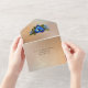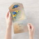 Elegante Hochzeit dreifach gefaltet alles in einer Einladung in einer goldenen Tonfarbe getan. Ein gerahmter Bereich für den benutzerdefinierten Text ist mit hübschen Grafiken von blauen und gelben Iris-Blume umgeben. Die passenden Hochzeitsprodukte stehen zur Verfügung.