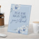 Dekorieren Sie Ihren Gästetisch mit diesem atemberaubenden stehenden Podestschild. Die Blume sind schön dekoriert, blau und blau, auf einem schieferblauen Hintergrund. Ideal für eine blaue Hochzeit, eine blaue Babydusche oder etwas blaues Brautparty!
