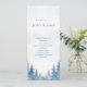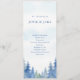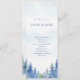 Dieses Hochzeitsprogramm besticht durch ein ruhiges blaues Aquarelldesign mit einer scheußlichen Silhouette am unteren Rand. Der sanfte Gradientenhintergrund wandelt sich von weich blau oben in ein sauberes, weißes Zentrum und schafft so einen friedlichen und eleganten Effekt. Das Layout ist modern und puristisch, mit einem klassischen Serif-Schriftart in Blau für alle Texte. Die Vorderseite zeigt die Namen des Paares und eine klare Reihenfolge der Zeremonie. Die Rückseite listet die Hochzeitsfeier, einschließlich Beamter, Eltern, Trauzeugin, Trauzeuge, Brautmädchen, Trauzeugen, Blume Mädchen und Ringträger. Eine herzliche Danksagung des Paares ist am Ende enthalten. Diese doppelseitige Karte eignet sich ideal für Hochzeiten im Wald, im Winter oder im Freien und bietet ein raffiniertes und beruhigendes Ambiente.