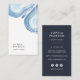 Chic Aquarell Visitenkarten in einem einzigartigen vertikalen Format zeigen Ihren Namen oder Firmennamen in der unteren links Ecke mit zwei Geode-agate-Slice-Illustrationen in ozeanblau Aquarell. Füge deine vollständigen Kontaktdaten auf der Rückseite in Weiß auf tiefblau der Marine hinzu. Enthält drei soziale Medien-Icons und ein Template-Feld für Ihren Benutzernamen.