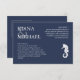 Die elegante Hochzeitssuite bietet klassische nautische Stilelemente mit einem sauberen, minimalistischen Look. Stilvolle Wellen in den Farbtönen von Aqua bis Marineblau und eine Seepferd-Illustration bieten einzigartige Akzente. Diese Hochzeitsdetails-Karte hier in weiß auf marineblau gezeigt, bietet viel Platz, um Ihren Gästen auf der Vorder- und Rückseite relevante Hochzeitsinformationen hinzuzufügen. Sehen Sie sich den Link Sammlung auf dieser Seite an, um alle passenden Elemente in diesem schönen Design zu sehen oder suchen Sie ID836.