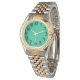 Diese Frauenuhr hat einen Art Deko-Design von blauen gekrümmten Linien in einer Dreieck-Form auf einem Feld von grün wiederholt über das Design. Woll eine andere Farbe? Nachricht.