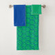 Dieses Handtuch-Set hat ein grünes Waschlappen, ein blaues Handtuch und ein Badetuch mit einem kunstvollen Deko aus blau gekrümmten Linien in einer Dreiecksform auf einem grünen Feld, das sich über das Design wiederholt. Woll eine andere Farbe? Nachricht.