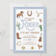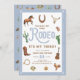 Diese niedliche Cowboy-Einladung sagt: "Das ist nicht mein erstes Rodeo, es ist mein drittes!" in einem erschütterten Western. Um sie herum sind Aquarell wilde West Illustrationen. Es endete mit einer staubigen blauen Grenze und einem winzigen kleinen Herzstück.