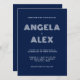 Ein dunkelmarineblau-weißer minimalistischer Deko Retro-geometrische Stil Informationen Hochzeitseinladung für Braut und Bräutigam. Abhängig von den Namen des Ehepaares können Sie den Schriftart verkleinern. Ändern Sie Hintergrund- und Schriftart-Farben, um Ihre Hochzeitsfarbenpalette anzupassen.