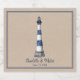 Designer Maura A. © für Sly Coconut Creative Designs. Ein elegantes Design mit einem handgezeichneten Leuchtturm in Blau und Weiß. Die helle kraft Hintergrundtextur ist ein Bild und optional. Der Name des Ehepaares ist in einem modernen Pinselskript und das Datum in einem modernen Schriftart. Schriftart und ihre Farben sind individuell einstellbar.