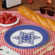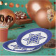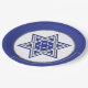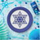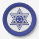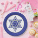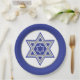 Hanukkah Themenpapierteller. Klassischer Hanukkah blauer Hintergrund mit einem Bild eines mehrschichtigen David-Stars in einem weißen Kreis. Die Größe ist optional, obwohl hier ein großer Tafeltisch zu sehen ist, können Sie ihn gegen die kleinere Größe eintauschen, wenn Sie möchten.