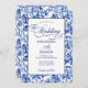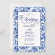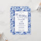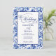 A wedding invitation featuring a blue and white floral toile design with calligraphy elements.