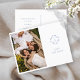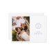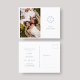 Chic mit jugendlicher Eleganz. Diese staubige, blau-weiße, flache Hochzeit spart das Datum der Postkarte einen frischen, modernen und jugendlichen Ton. Auf der Vorderseite der Karte befindet sich ein zeitgenössisches Set von Schriftart in staubblauen und eleganten blumengeschmückten Paar Monogramm und Foto, vor einem knusprigen, weißen Hintergrund. Die Details werden auf der Rückseite mit optionalem Rand und zusätzlichem Text wiederholt.