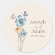Simple Blue Wildblume Butterflies Floral Wedding Classic Round Sticker - Dieses Hochzeitsdesign zeigt ein einfaches Layout mit Aquarellfarben-Wildblumen, sanften blauen Blütenblättern und Schmetterlingsbildern - ideal für ein naturliebes Paar.