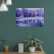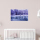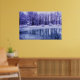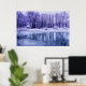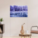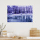 Dieses Kunstposter präsentiert eine saisonale Winterlandschaft in Blau, Violett, Grau, Weiß und lila. Die Bäume sind kahl. Eis bedeckt einen Teil des Wassers, aber schöne Reflexionen von Baum, Wolken und Himmel scheinen durch. Schnee umgibt den Teich.