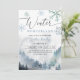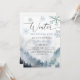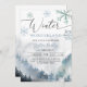 Die Geburtstagsparty-Einladung des modernen Jungen mit der Aquarellkunst des Winterberges mit Kiefern mit blauen Schneeflocken. Im Text steht "Winter Wonderland".
