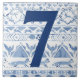 Eine große Zahl 7 in dunkelblau ist vorne und Mitte auf dieser Hausnummer Adresse Kachel. Mein einzigartiges Design in erfrischendem Blau und knusprig Weiß zeichnet sich durch eine Interpretation der traditionellen geometrischen Ikat-Stoffweavings aus. Ich habe Waldtiere in das Muster aufgenommen - Füchse, Hasen, Vögel und mehr. Ideal für blaue und weiße Fans und für alle, die Tiere Lieben. Erhältlich in zwei Größen. Whimsical Original Aquarellkunst & Design von Tuzi Williams.