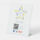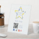 With its captivating design and vibrant blue and yellow colors, this pedestal not only announces your presence at the fair but also invites onlookers to come closer and explore your products. Additionally, it incorporates a QR code that allows visitors to scan and discover more about your brand and creations.