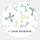 Schöne wissenschaftliche Aufkleber mit einem Molekül Muster in blau und gelb Farben. Das Gefühl lautet "I Liebe Science", aber man kann es mit eigenen Worten personalisieren. Perfekte Aufkleber für Party, Meetings und vieles mehr. Designed by Patricia Alvarez.