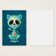 Dieses hübsche blaue Kätzchen-Design ist mit Wirbel und Punktmustern dekoriert. Gelbe Blume-Pedale umkreisen die reinen schwarzen Augen in der Tradition des Tages der toten Zuckerschädel. Die Katze sitzt da unten und sieht nach vorn, wie ihr Schwanz im Hintergrund windet. Der übergroße Kopf sitzt auf einem winzigen Körper, der ein spielerisches, Cartoon-ähnliches Aussehen schafft. Ein Fünf-Punkte-Stern sitzt in der Mitte der Stirn des Kätzchens, während in der Mitte der Brust ein leuchtend rotes und gelbes Herz auftaucht. Diese niedliche kleine Katze ist ein lustiges und stilvolles Design, inspiriert durch die wunderschönen Muster des Tages der toten Zuckerschädel.