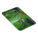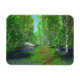 Ein überwucherter Weg, der an einem sonnigen Sommertag durch den Birkenwald schlängelt. Im Schatten der Bäume häufen sich Teppiche von Bluebells in Blautönen und lila im Kontrast zum Frühlingsgrün des Grases und Birken.