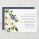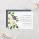 Unsere Blueberry Lane Hochzeitseinladung enthält Ihre Hochzeitsdetails, die rechts ausgerichtet sind und von indigoblauen und elfenbeinfarbenen Blume, Heidelbeeren und grünem Blattwerk geprägt sind.
