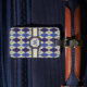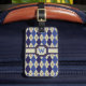 Raute geht 8-Bit mit diesem prächtigen marineblauen, denim blauen und khaki Farbschema mit einem kräftigen braunen Kontraststich und schafft so einen perfekten Look für Liebhaber dieses klassischen Musters. Passen Sie das Monogramm mit dem entsprechenden Initial und den Details auf der Rückseite für eine personalisierte Touch an.