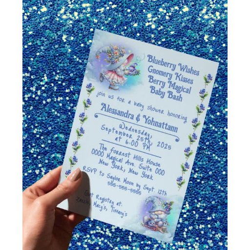 Das Babyduschenschild "Blueberry Wings and Gnomery Kisses" mit einem lustigen Satz, der individuell angepasst werden kann, und hellblauen Wolken als Hintergrund. Vergessen Sie nicht, sie mit Ihren Namen und Ihrem Datum zu personalisieren. Die Abbildung ist einfach niedlich und magisch. Dieses Design setzt sich mit den blauen und lila Farbtönen fort, die ein zauberhaftes Motiv aus Heidelbeere und Gaumenfreuden kombinieren, die saftige Blaubeeren mit skurrilen Gnomen verbinden, um Freude und Verwunderung unter all Ihren Gästen inspirieren. Machen Sie Ihre Babydusche unvergesslich! Entdecken Sie unsere Kollektion für mehr lustige Ideen, um diesen besondere Anlass zu feiern.
