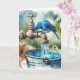 Ein lebendiger Blauvogel sitzt auf einem Wasserhahn und beobachtet neugierig, wie Wasser in einen Metalleimer unten fließt, um an Sie zu denken. Der Insider-Text kann geändert werden.