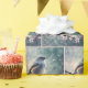 Bluebird sitzend auf Kirschblütenzweig durch ein regnerisches Fenster mit rosa Grenze.