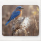 A vibrant bluebird perched on a dried milkweed pod displays its bright plumage against a softly blurred background