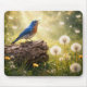 A bluebird sits on a log amidst dandelions and shimmering musical notes, with warm sunlight filtering through the scene