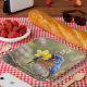 A bluebird perched on a rustic wooden fence in a garden, using a spring yellow daffodil as a microphone