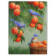 Zwei Western Bluebirds stehen in einem Pfirsichbaum, während ein dritter Bluebird auf einem Korb sitzt, der mit frisch geerntetem, marktreif geerntetem Obst gefüllt ist. Realistische Kunstwerke, die aus einer Ölmalerei des Künstlers Crista S. Forest entstanden sind.