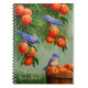 Zwei Western Bluebirds stehen in einem Pfirsichbaum, während ein dritter Bluebird auf einem Korb sitzt, der mit frisch geerntetem, marktreif geerntetem Obst gefüllt ist. Realistische Kunstwerke, die aus einer Ölmalerei des Künstlers Crista S. Forest entstanden sind.