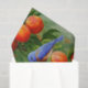 Zwei Western Bluebirds stehen in einem Pfirsichbaum, während ein dritter Bluebird auf einem Korb sitzt, der mit frisch geerntetem, marktreif geerntetem Obst gefüllt ist. Realistische Kunstwerke, die aus einer Ölmalerei des Künstlers Crista S. Forest entstanden sind.