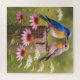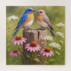 Two vibrant bluebirds perch atop a wooden fence post, surrounded by blooming pink cone flowers and white Queen Anne's Lace flowers in a summer meadow