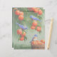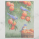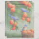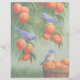 Zwei Western Bluebirds stehen in einem Pfirsichbaum, während ein dritter Bluebird auf einem Holzkorb sitzt, der mit frisch geerntetem, marktreif geerntetem Obst gefüllt ist. Akzentriert mit einem passenden gemusterten Hintergrund.