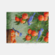 Zwei Western Bluebirds stehen in einem Pfirsichbaum, während ein dritter Bluebird auf einem Holzkorb sitzt, der mit frisch geerntetem, marktreif geerntetem Obst gefüllt ist.