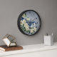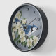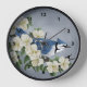 Vogel-Uhren mit Blauer Jay, die auf einem blühenden Hengstzweig stehen.