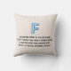 A detailed blueprint-style illustration of the letter F is presented against a vibrant blue background. The letter itself is rendered in white, with intricate details and precise measurements indicated by thin white lines. The back of the pillow includes a blue outline of the letter F set against a textured light beige background with a 4-line poem about the letter below.