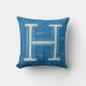 A detailed blueprint-style illustration of the letter H is presented against a vibrant blue background. The letter itself is rendered in white, with intricate details and precise measurements indicated by thin white lines. The back of the pillow includes a blue outline of the letter H set against a textured light beige background with a 4-line poem about the letter below.