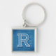 A detailed blueprint-style illustration of the letter R is presented against a vibrant blue background. The letter itself is rendered in white, with intricate details and precise measurements indicated by thin white lines.