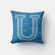 A detailed blueprint-style illustration of the letter U is presented against a vibrant blue background. The letter itself is rendered in white, with intricate details and precise measurements indicated by thin white lines. The back of the pillow includes a blue outline of the letter U set against a textured light beige background with a 4-line poem about the letter below.
