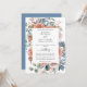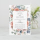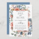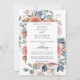 Freuen Sie sich auf diese atemberaubende botanische Blumeneinladung mit einem wunderschönen, handbemalten Aquarellbouquet in einer delikaten Mischung aus rosa, pfirsichfarbenen, Elfenbein, sanften Korallen, staubblauen, blauen und grünen Farbtönen. Überlagern Sie eleganten Teil mit Ihren Details, durch goldenen Rahmen. Moderne kalligraphische Elemente. Die Karte ist wieder in elegantem, staubigen, blauen Schatten. Teil unserer "Blissful Floral" Hochzeitskollektion und Veranstaltungsreihe.