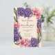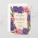 Ein schönes Blumendesign perfekte Einladung zur Hochzeit. Es zeichnet sich durch eine raffinierte Anordnung von lebhaften rosa und violetten Blumen aus, die wahrscheinlich von Dahlien und Hyazinthen inspiriert werden, sowie durch elegantes grünes Blattwerk. Die Blume umrahmen einen leeren rechteckigen Bereich in der Mitte, der von zarten Linien umgeben ist und einen Leerraum schafft, der sich ideal für personalisierte Texte wie Namen, Daten oder Hochzeitsdetails eignet. Der weiche, pastellfarbene Hintergrund ergänzt die lebhaften Farben der Blume und macht sie zu einer eleganten und romantischen Wahl für Hochzeitsauflagen.