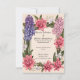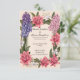 Ein schönes Blumendesign perfekte Einladung zur Hochzeit. Es zeichnet sich durch eine raffinierte Anordnung von lebhaften rosa und violetten Blumen aus, die wahrscheinlich von Dahlien und Hyazinthen inspiriert werden, sowie durch elegantes grünes Blattwerk. Die Blume umrahmen einen leeren rechteckigen Bereich in der Mitte, der von zarten Linien umgeben ist und einen Leerraum schafft, der sich ideal für personalisierte Texte wie Namen, Daten oder Hochzeitsdetails eignet. Der weiche, pastellfarbene Hintergrund ergänzt die lebhaften Farben der Blume und macht sie zu einer eleganten und romantischen Wahl für Hochzeitsauflagen.