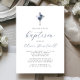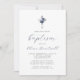 Diese elegante Taufveranstaltung mit einem Aquarellbouquet aus staubblauen und marineblau blauen Blumen und silberfarbenem Blattwerk auf einem silbernen Imitat-Folienkreuz, über den Worten "Bitte schließen Sie uns für die Taufe unseres Sohnes" in eleganter marineblauer Handschrift Kalligraphie und Holzkohlegrau kursiv. Personalisieren Sie es mit dem Namen in blauem Skript und die Details in grauen Sans Serif Schriftart.